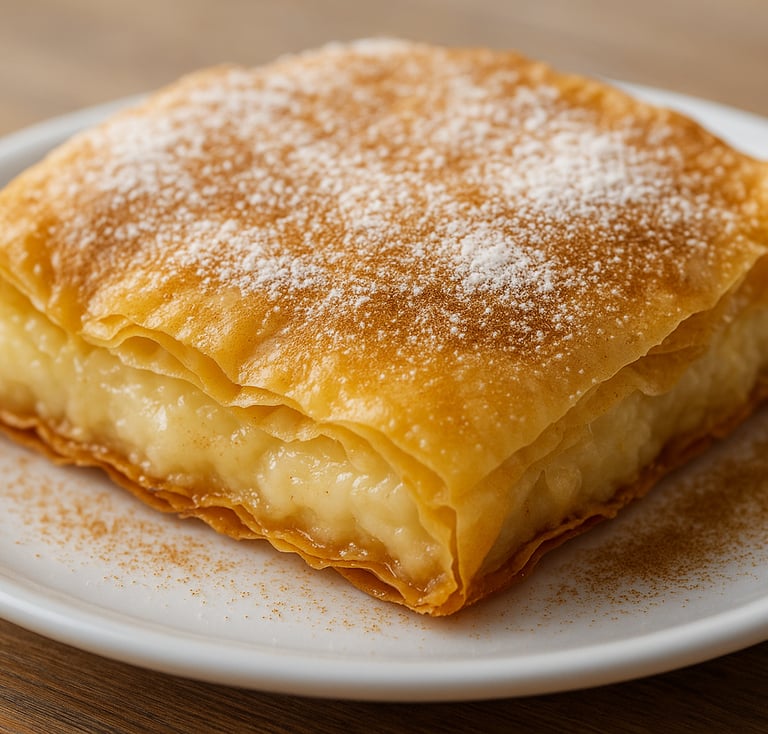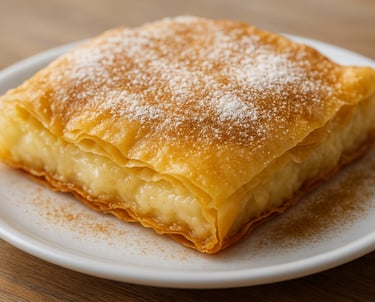 A sweet pastry filled with semolina custard, dusted with cinnamon and sugar. A must for breakfast or an afternoon treat.